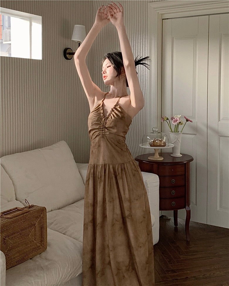 A graceful blend of Eastern minimalism and modern femininity. This halter-style maxi dress features a delicate ruched V-neckline and a softly gathered waist, falling into a fluid, tea-dyed skirt. The subtle tie-dye texture and earthy tone echo vintage Chinese aesthetics, making it perfect for slow mornings, artful spaces, or thoughtful gatherings.