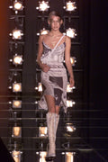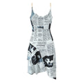 With a bold vintage newspaper layout, asymmetrical hemline, and delicate spaghetti straps, this piece echoes the sensual, archival energy of the Y2K era.