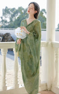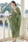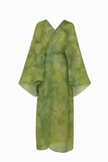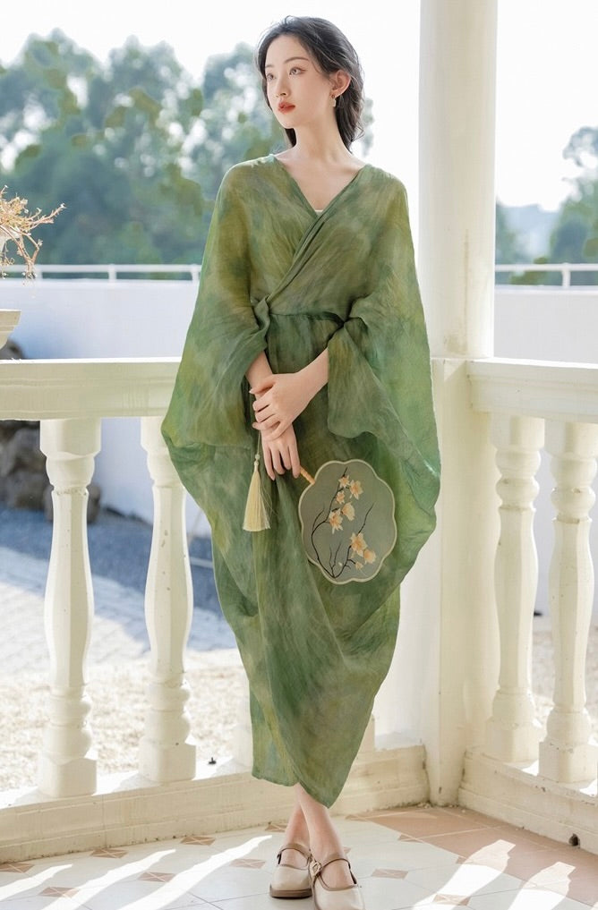 A poetic blend of nature and elegance, this flowing robe-style dress features a soft jade green hue reminiscent of early spring willows. Crafted in a lightweight, translucent fabric, it drapes effortlessly with wide sleeves and a flattering cross-wrap silhouette.